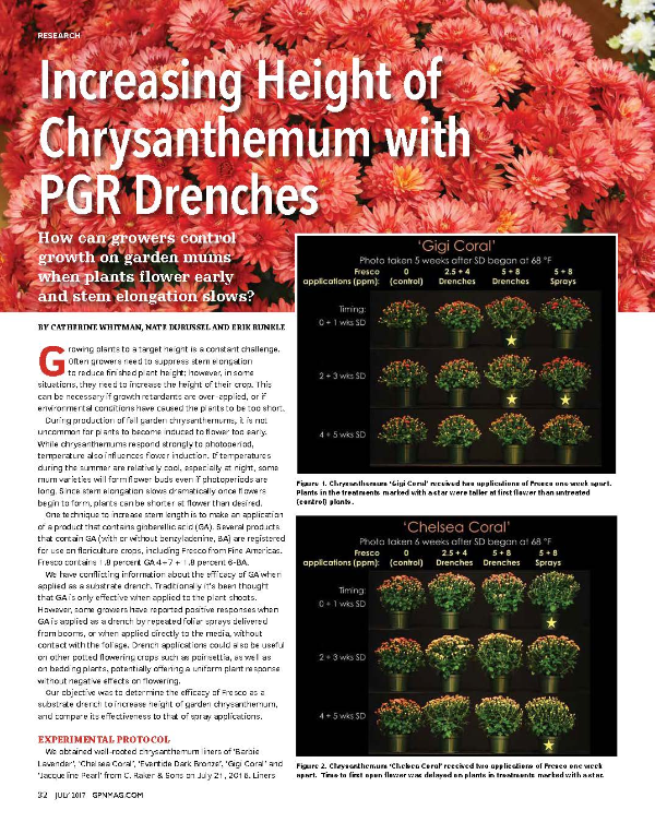When applied as a substrate drench, the plant growth regulator (PGR) Fresco can increase stem elongation in at least some varieties of potted garden mums.