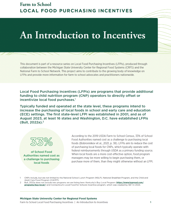 This document is part of a resource series on Local Food Purchasing Incentives (LFPIs), produced through collaboration between the Michigan State University Center for Regional Food Systems (CRFS) and the National Farm to School Network. This project aims to contribute to the growing body of knowledge on LFPIs and provide more information for farm to school advocates and practitioners nationwide.