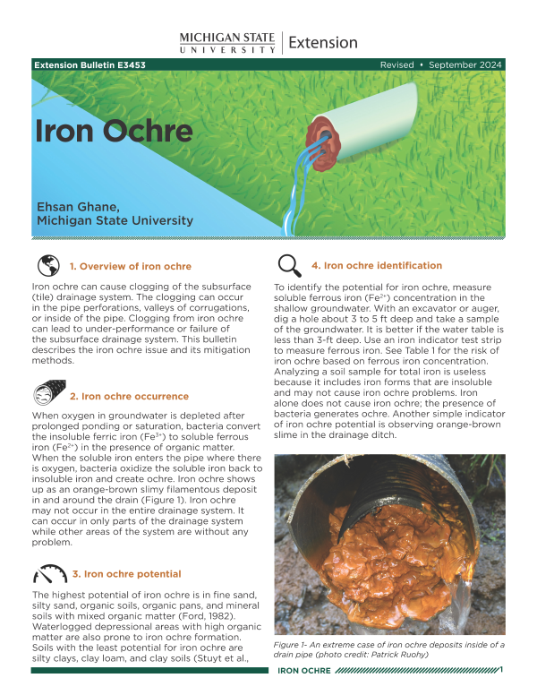 Iron ochre can cause clogging of the subsurface (tile) drainage system. The clogging can occur in the pipe perforations, valleys of corrugations, or inside of the pipe. Clogging from iron ochre can lead to under-performance or failure of the subsurface drainage system. This bulletin describes the iron ochre issue and its mitigation methods.