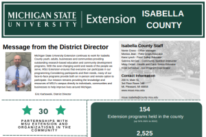 Once again, it is my pleasure to share the results of another successful year of partnership between Isabella County and Michigan State University (MSU) Extension. With your continued support, our team at MSU Extension has made a difference in the lives of youth, families, businesses, and Isabella County residents through our broad range of research-based educational programs and services!