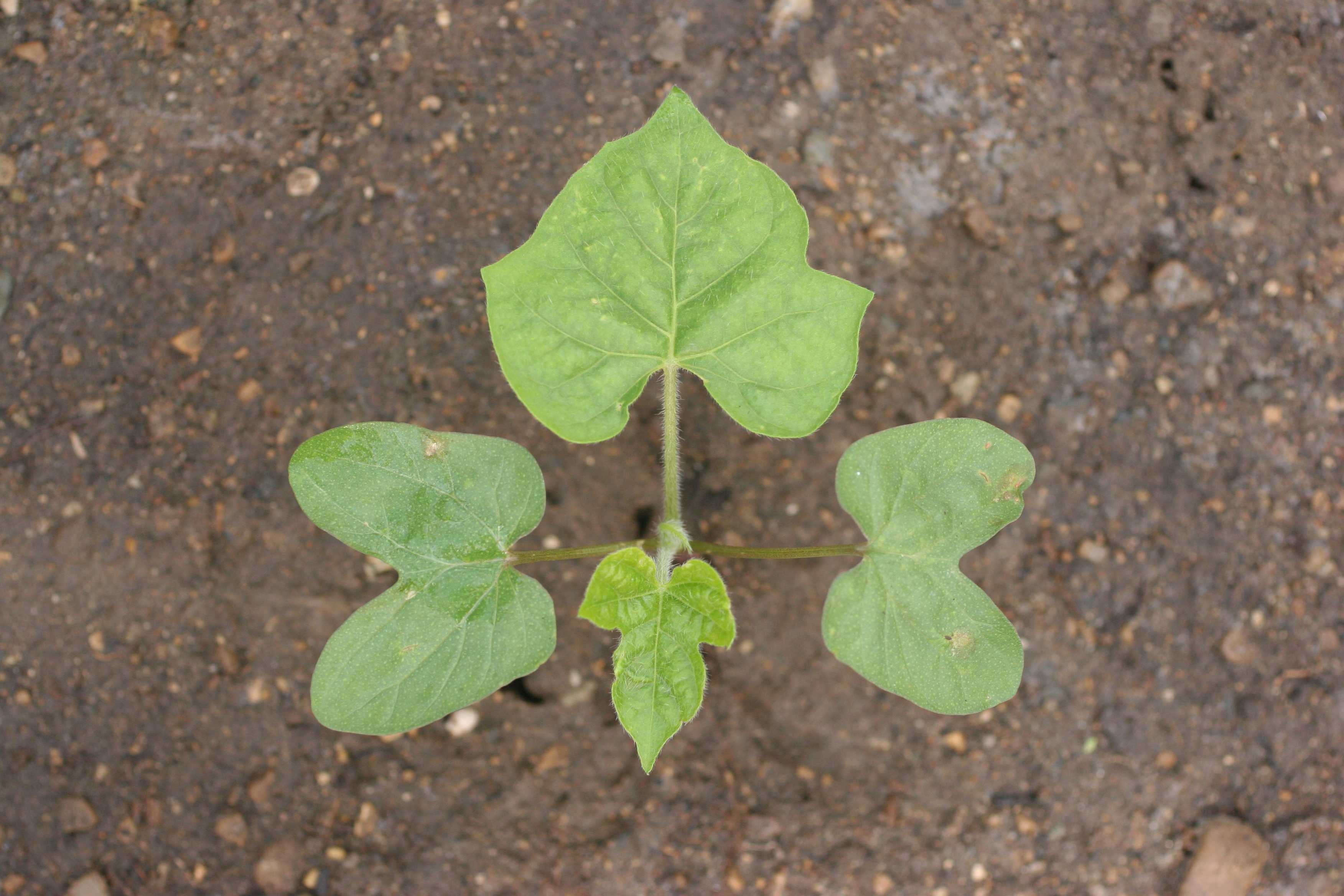 Cotyledons are butterfly-shaped and usually narrower at the base. Leaves are alternate with erect hairs on both surfaces. The first leaf may be unlobed; all other leaves are three-lobed and ivy-shaped.