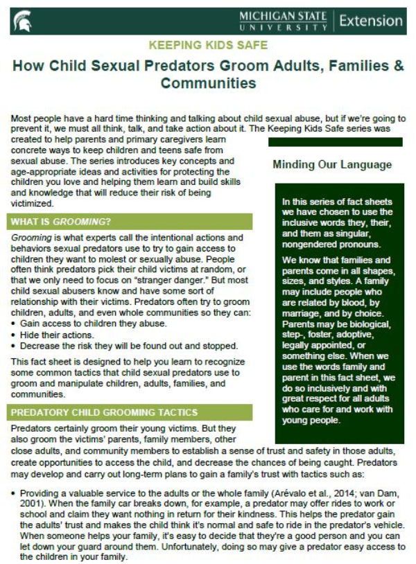 This fact sheet helps parents and other adults who work with or care for children understand the process of “grooming” or manipulating children in order to abuse them. It is part of the “Keeping Kids Safe” series that is designed for parents and adults who work with kids from birth to age 17. The fact sheet covers issues related to how sexual predators groom children, adults, families, and communities to make it easier for themselves to abuse children and discusses how to recognize potential grooming attempts.