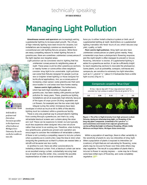 While electric lighting is increasingly used in greenhouses to increase plant growth, yield, and quality, it can have unintended consequences to neighboring areas at night.