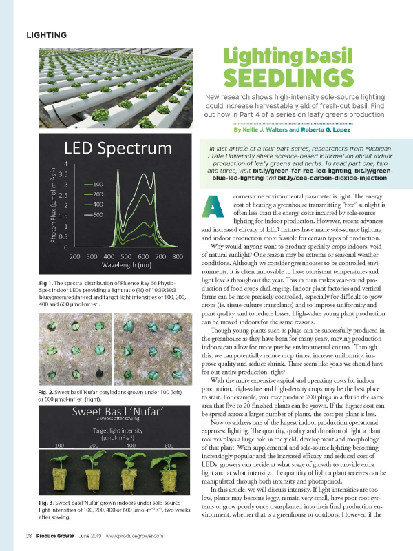 Indoor production of leafy greens, Part 4 of 4: Research shows that providing high-intensity sole-source lighting to seedlings can increase harvestable yield of fresh-cut basil.