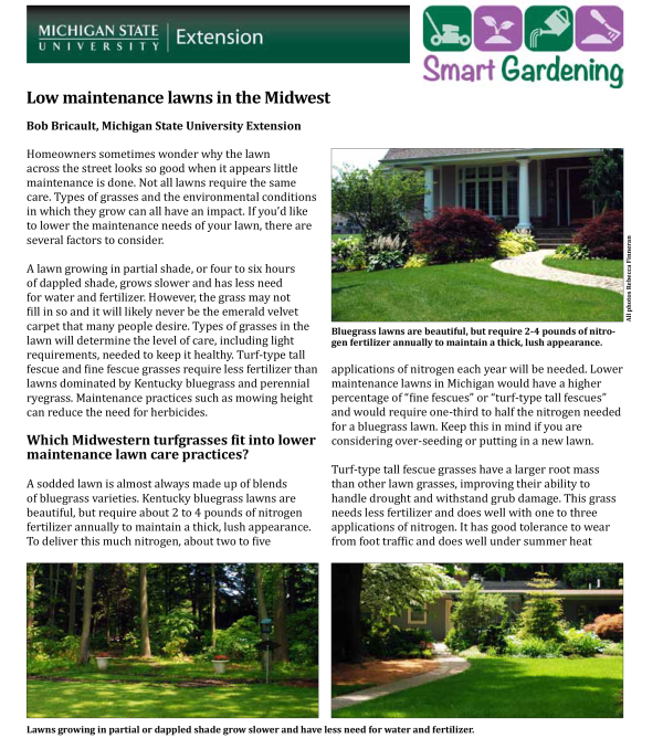 There are several smart gardening practices that support a low maintenance lawn. Mowing the grass at 3 to 3.5 inches tall reduces the possibility of weed seeds germinating, lessens water loss to evaporation and helps build a larger root mass that is more tolerant to drought. Read the Smart Gardening tip sheet “Mow high for weed and grub control” for more information.