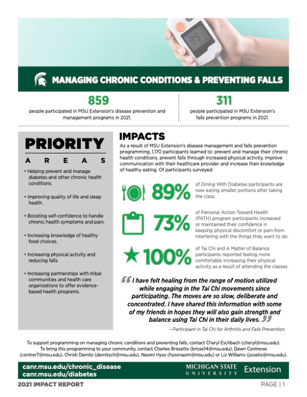 To support programming on managing chronic conditions and preventing falls, contact Cheryl Eschbach (cheryl@msu.edu). To bring this programming to your community, contact Charlee Brissette (brisse14@msu.edu), Dawn Contreras (contrer7@msu.edu), Christi Demitz (demitzch@msu.edu), Naomi Hyso (hysonaom@msu.edu) or Liz Williams (josaitis@msu.edu).