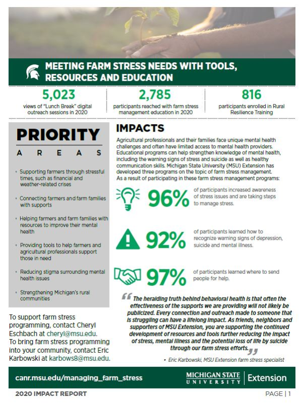 Agricultural professionals and their families face unique mental health challenges and often have limited access to mental health providers. Educational programs can help strengthen knowledge of mental health, including the warning signs of stress and suicide as well as healthy communication skills. Michigan State University (MSU) Extension has developed three programs on the topic of farm stress management.