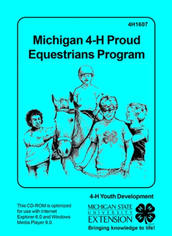 The Michigan 4-H Proud Equestrians Program CD-ROM is a comprehensive resource is designed to provide information for county 4-H programs interested in developing and supporting a locally funded 4-H Proud Equestrians Program (PEP). The guide provides information on creating a safe environment in which people with disabilities, assisted by trained volunteers, can learn and practice riding and horsemanship skills under the direction of a certified therapeutic riding instructor. The document linked here lists the CD's contents, price and ordering information for it, and contact information for learning more about 4-H PEP.