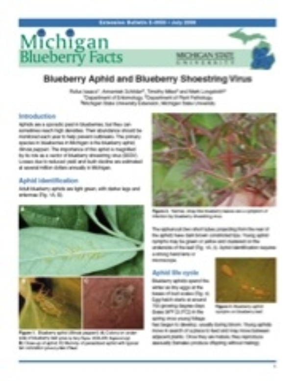 Aphids are a sporadic pest in blueberries, but they can sometimes reach high densities. Their abundance should be monitored each year to help prevent outbreaks. The primary species in blueberries in Michigan is the blueberry aphid, Illinoia pepperi. The importance of this aphid is magnified by its role as a vector of blueberry shoestring virus (BSSV). Losses due to reduced yield and bush decline are estimated at several million dollars annually in Michigan.