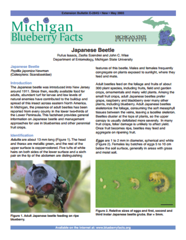 The Japanese beetle was introduced into New Jersey around 1911. Since then, readily available food for adults, abundant turf for larvae and low levels of natural enemies have contributed to the buildup and spread of this insect across eastern North America. In Michigan, the presence of adult beetles has been reported from every county in the lower two-thirds of the Lower Peninsula. This factsheet provides general information on Japanese beetle and management approaches for use in blueberries and other perennial fruit crops.