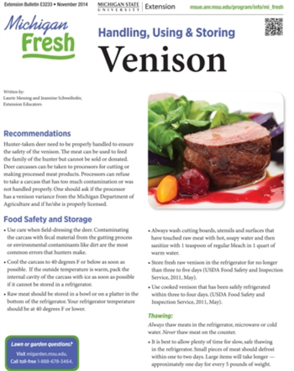 Hunter-taken deer need to be properly handled to ensure the safety of the venison. The meat can be used to feed the family of the hunter but cannot be sold or donated. Deer carcasses can be taken to processors for cutting or making processed meat products. Processors can refuse to take a carcass that has too much contamination or was not handled properly. One should ask if the processor has a venison variance from the Michigan Department of Agriculture and if he/she is properly licensed.