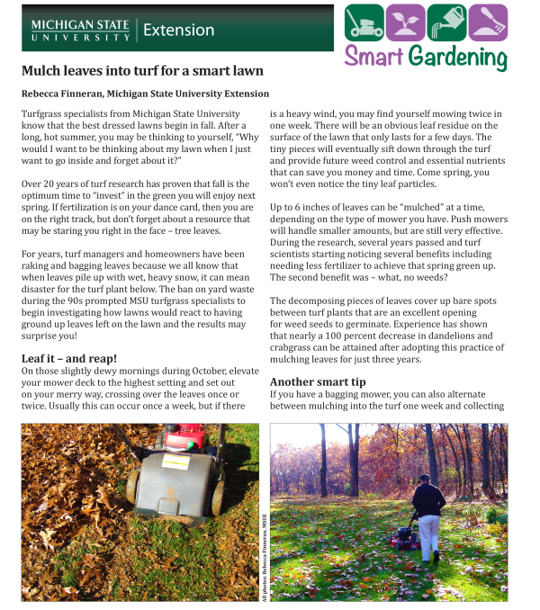 For years, turf managers and homeowners have been raking and bagging leaves because we all know that when leaves pile up with wet, heavy snow, it can mean disaster for the turf plant below. The ban on yard waste during the 90s prompted MSU turfgrass specialists to begin investigating how lawns would react to having ground up leaves left on the lawn and the results may surprise you!