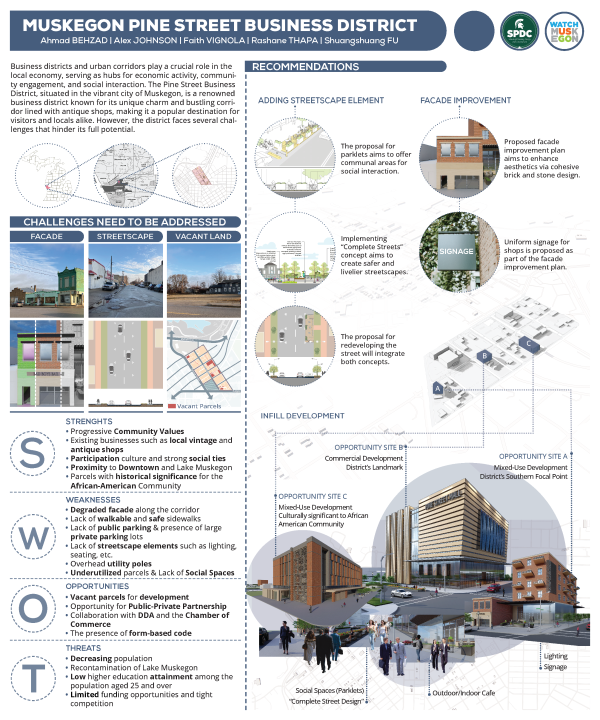 The Practicum team has worked closely in collaboration with the City of Muskegon to develop a comprehensive improvement plan for the Pine Street business district. The Pine Street Business District Improvement Plan aims to address the challenges, leverage strengths and opportunities, and tap into the market potential to revitalize the Pine Street Business District, promote economic growth, enhance the pedestrian experience, and create vibrant social spaces. By fostering collaboration among stakeholders, implementing innovative solutions, and leveraging available resources, the Pine Street Business District can become a thriving and sustainable business corridor that benefits the local community and the overall economy of Muskegon.