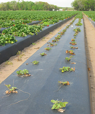 It is imperative healthy runners are planted into nematode-free soil. Any strawberry plants diagnosed with these nematodes should be rogued out as well as 3-5 of its nearest neighbors. Both foliar and stem nematodes are highly resistant to desiccation and can survive in old leaf tissue up to 2 years or more. If a site is infested, bare fallow is the best tactic especially for Aphelenchoides sp. Good weed control is critical. Strawberry nursery stock can be treated with a nematicide but there are no products labeled for bearing plants.