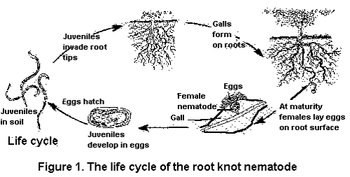 The northern root-knot nematode (NRKN) overwinters in the soil as eggs in annual cropping systems. As soil temperatures increase in the spring, second-stage juveniles hatch from these eggs, migrate through the soil and penetrate the roots of host plants.