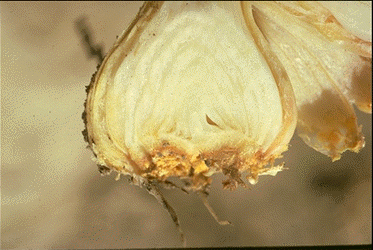 Deformity of leaves and bulbs are the most common symptoms of stem and bulb nematode infestations in onion. Yellowing of leaves may develop with blisters. Young plants are often deformed or may be killed at high infestations if other pathogens are also present. Older, infected bulbs show swelling (bloating) of the scales with cracks often occurring at the root disc of the bulb. These bulbs are often soft and when cut open reveal concentric rings of brown leaf scales. Infected bulbs can rot in storage because they are often invaded with soft-rot bacteria.