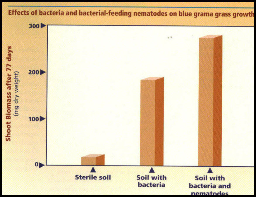Graph demonstrating improved growth of a blue grama grass in the presence of bacteria and bacterial-feeding nematodes compared to sterile soil. (credit R. Ingram, Oregon State University, 1985).
