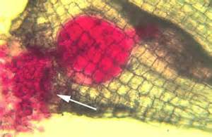 A stained root-knot nematode female with eggs (tip of arrow) inside a gall (credit coursewares.mju.ac.th)
