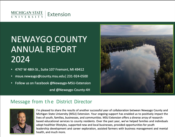I'm pleased to share the results of another successful year of collaboration between Newaygo County and Michigan State University (MSU) Extension. Your ongoing support has enabled us to positively impact the lives of youth, families, businesses, and communities. MSU Extension offers a diverse array of research- based educational services to county residents. Over the past year, we've helped families and individuals adopt healthier lifestyles, supported new and local businesses, provided opportunities for youth leadership development and career exploration, assisted farmers with business management and mental health, and much more.