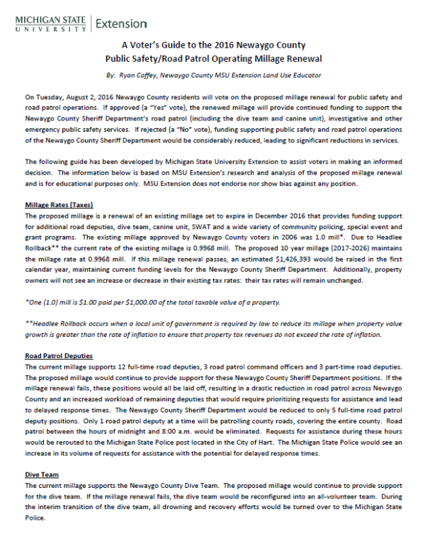 A Voter's Guide to the 2016 Newaygo County Public Safety/Road Patrol Operating MIllage Renewal