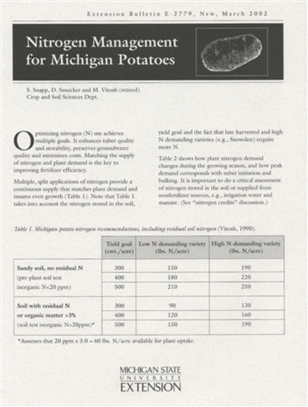Vitosh, M.L., 1990. Potato Fertilizer Recommendations. MSU Extension Bulletin E-2220. 8 pp.