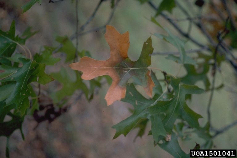 Symptoms: Leaves on infected trees initially become dull green and appear wilted. Many leaves develop bronze/brown tissues from their tips and margins to the base and midrib. Hence, there is usually a distinct line between green and brown tissue. These symptoms can be confused with bacterial leaf scorch, anthracnose, Tubakia leaf spot, environmental scorch, iron chlorosis, drought, winter injury, among others.