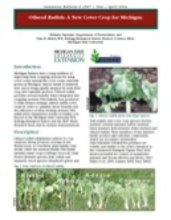 Michigan farmers have a long tradition of improving their cropping systems by using cover crops.Among the cover crops currently grown in Michigan, oilseed radish is relatively new and is being rapidly adopted by both field crop and vegetable growers. Oilseed radish provides several benefits when integrated into cropping systems.This bulletin was produced to help farmers manage oilseed radish cover crops in order to optimize those benefits and the efficiency of their farming systems.This publication summarizes results of studies conducted at the Michigan State University W.K. Kellogg Biological Station and the MSU Muck Research Farm, and in on-farm demonstrations.