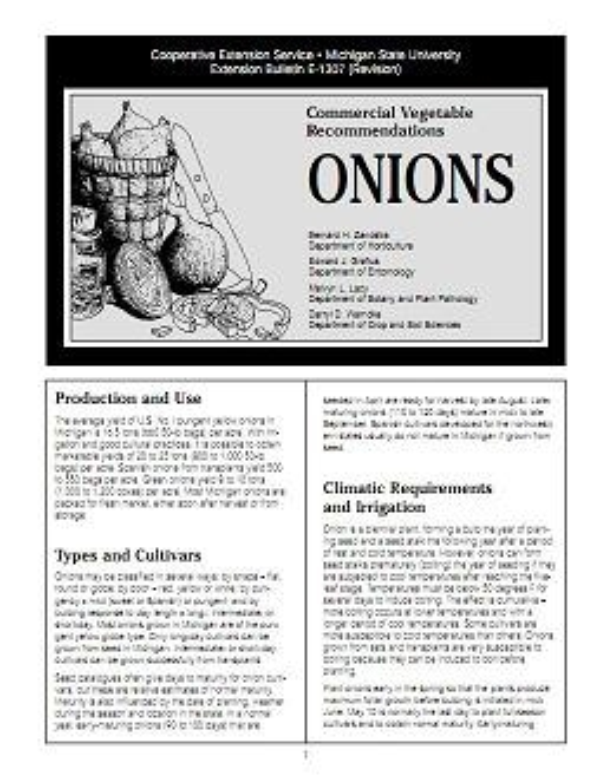 More information on onion production is available in the following bulletins, available from county MSU Extension offices, or from the MSU Bulletin Office, Agriculture Hall, East Lansing, Michigan 48824-1039. (All orders totalling less than $100 must be prepaid.)
