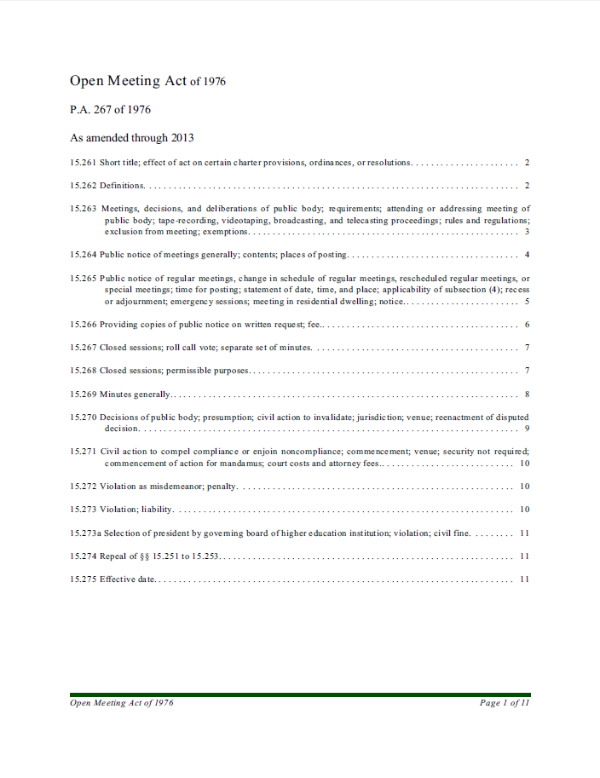The Open Meeting act applies to planning commissions, zoning boards, zoning boards of appeals and virtually all deliberations and voting at those meetings. This version is as amended through 2016, effective March 10, 2017.