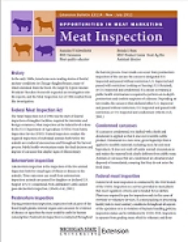 All meat products sold interstate are required to have USDA inspection, with the exception of a few states that are currently piloting a program with the USDA. In Michigan, all meat sold either is USDA inspected or is sold through a retail establishment that has a variance license issued by the Michigan Department of Agriculture and Rural Development (MDARD). Retailers that are further cutting or processing meat for sale under the retail variance must start with USDAinspected meat. The meat will no longer bear the USDA inspection mark once it is processed in a retail establishment and must be sold only to consumers that come to the retail establishment. These retailers are subject to inspection by MDARD. Meat sold at farmers’ markets must be USDAinspected, and each package must have an approved label and USDA inspection mark on it.