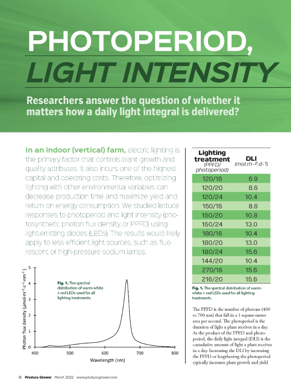 We report and discuss research results when growing lettuce indoors under different light intensities and photoperiods under a range of daily light integrals.