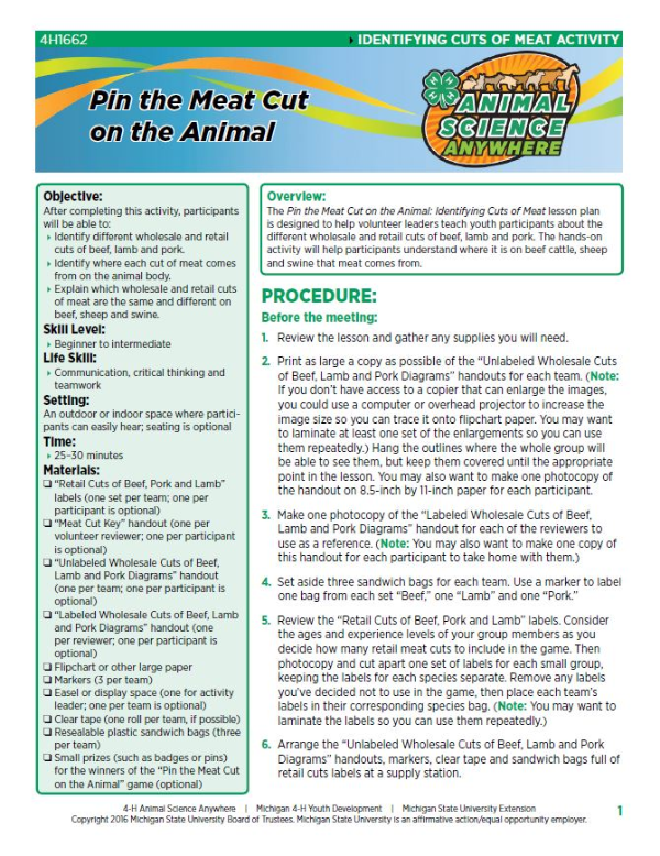 The Pin the Meat Cut on the Animal: Identifying Cuts of Meat lesson plan is designed to help volunteer leaders teach youth participants about the different wholesale and retail cuts of beef, lamb and pork. The hands-on activity will help participants understand where it is on beef cattle, sheep and swine that meat comes from.