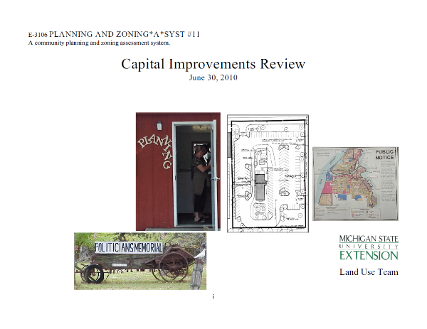 Planning and Zoning*A*Syst. #11: Capital Improvements Review (E3106) provides a review of the process for the planning commission to review and comment on local government construction projects (which are otherwise not subject to zoning) and outlines how this review can be used as a constructive way to ensure that government-funded projects comply with the adopted plan and local ordinances. By Brad Neumann, Senior Extension Educator; Kurt H. Schindler, Senior Extension Educator; and Jasneet Sharma, Extension Educator.