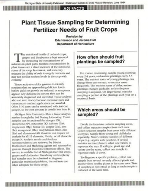Michigan State University offers a tissue analysis service through the Soil Testing Laboratory. Tissue samples can be analyzed for nitrogen (N), phosphorus (P), potassium (K), calcium (Ca), magnesium (Mg), boron (B), copper (Cu), iron (Fe), manganese (Mn), molybdenum (Mo), zinc (Zn) and aluminum (Al). Growers can request an analysis for all 12 elements, N only, or all elements except N. Analysis results and fertilizer recommendations are reviewed by District Horticulture and Marketing Agents and returned to growers through local MSU Extension offices. The service is available for all Michigan tree fruit crops, grapes and blueberries. Strawberry and raspberry leaf samples may be submitted to diagnose particular nutritional problems, but soil tests are often adequate for these crops.
