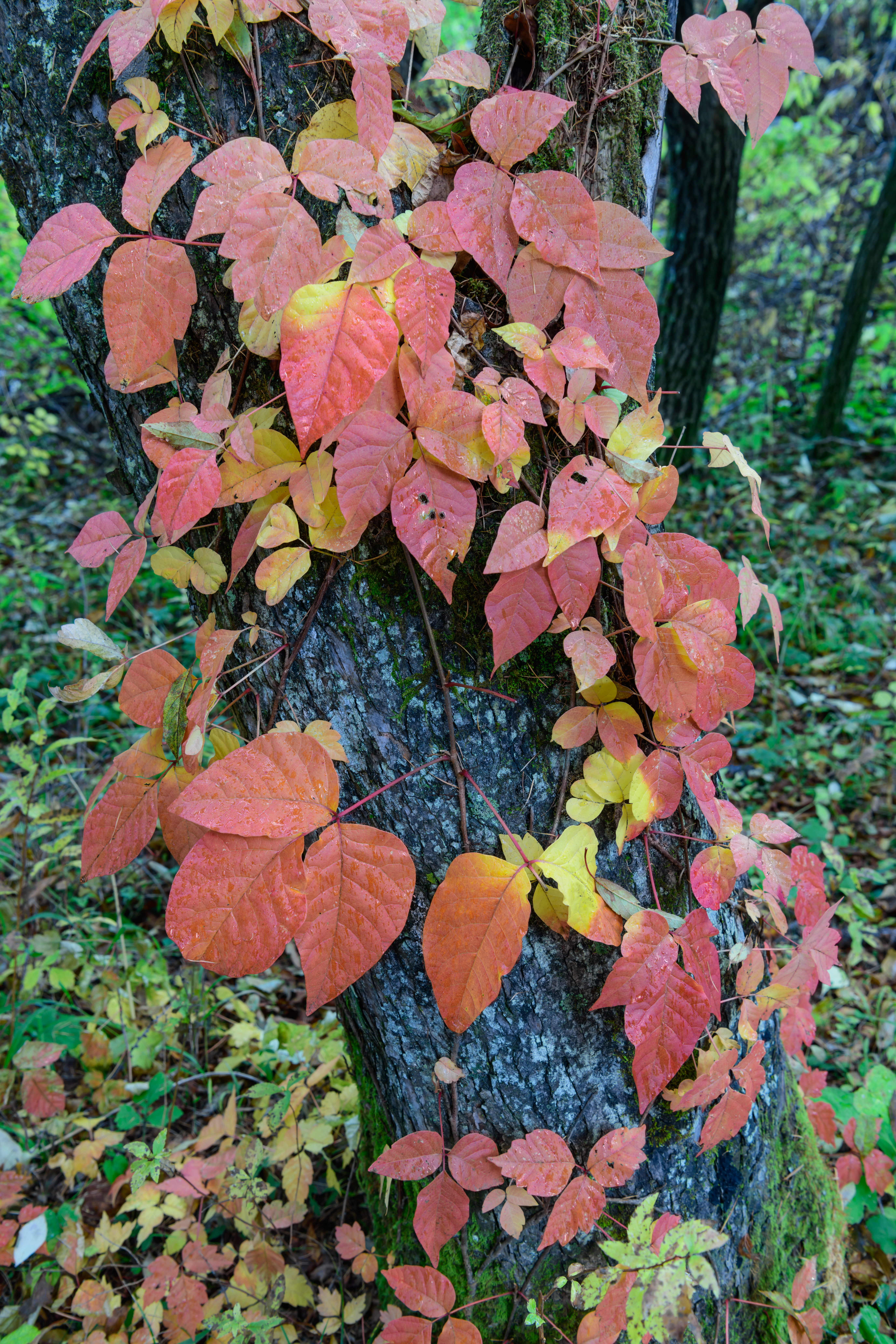 Besides their architecture, the other features of these two species are similar. Both are woody perennials native to Michigan. Both have compound leaves bearing three leaflets apiece (“leaves of three”), which are arranged alternately along the stem (Figure 6). Leaves are shiny and often dark green, though coloration can vary with growing conditions. Leaflet margins may be smooth, irregularly toothed, or lobed. On each leaf, the two lower leaflets have very short stalks (petioles) and often have “thumb-like” lobes at their bases (Figure 7), while the center leaflet sits on its own longer stalk. Leaves turn red in the fall (Figure 8). Both species frequently produce rhizomes or underground stems, which allows them to spread vegetatively. Mature individuals can also produce clusters of small yellow-green flowers with five petals. These flowers eventually turn into berries that are greyish to white. The berries contain the seeds of poison ivy and facilitate dispersal by birds and other wildlife. Animals such as birds and household pets are not sensitive to the allergen in poison ivy, unlike most humans (see the “Urushiol” section for more information).