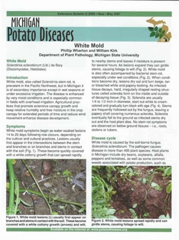 White mold is caused by the soil-borne fungus Sclertotinia sclerotiorum. The pathogen causes disease in more than 400 plant species. Host plants in Michigan include dry beans, soybeans, alfalfa, peppers and tomatoes, as well as some common weeds associated with potato production, such as lambsquarters, pigweed and nightshade. Sclerotinia sclerotiorum overwinters from one growing season to the next as sclerotia that can also survive in the soil for several years. Sclerotia require a conditioning period of cool temperatures before they can germinate, but these chilling requirements are normally met during Michigan winters.