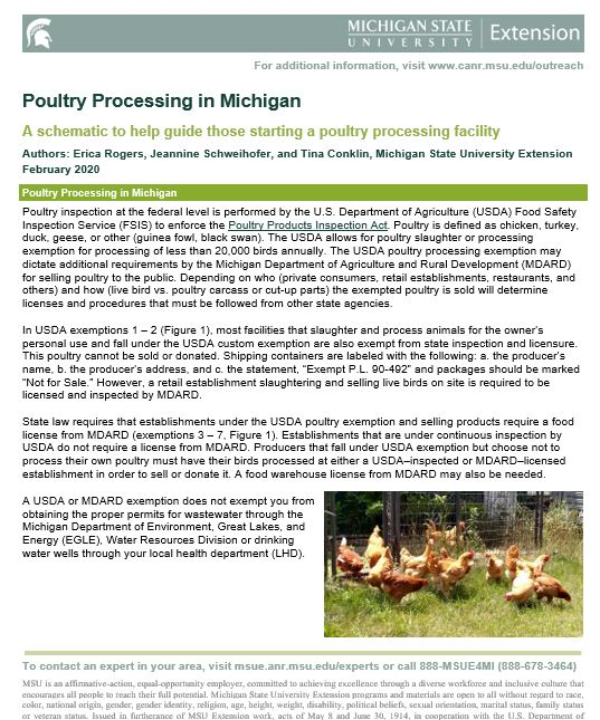 Poultry inspection at the federal level is performed by the U.S. Department of Agriculture (USDA) Food Safety Inspection Service (FSIS) to enforce the Poultry Products Inspection Act. Poultry is defined as chicken, turkey, duck, geese, or other (guinea fowl, black swan). The USDA allows for poultry slaughter or processing exemption for processing of less than 20,000 birds annually. The USDA poultry processing exemption may dictate additional requirements by the Michigan Department of Agriculture and Rural Development (MDARD) for selling poultry to the public. Depending on who (private consumers, retail establishments, restaurants, and others) and how (live bird vs. poultry carcass or cut-up parts) the exempted poultry is sold will determine licenses and procedures that must be followed from other state agencies.