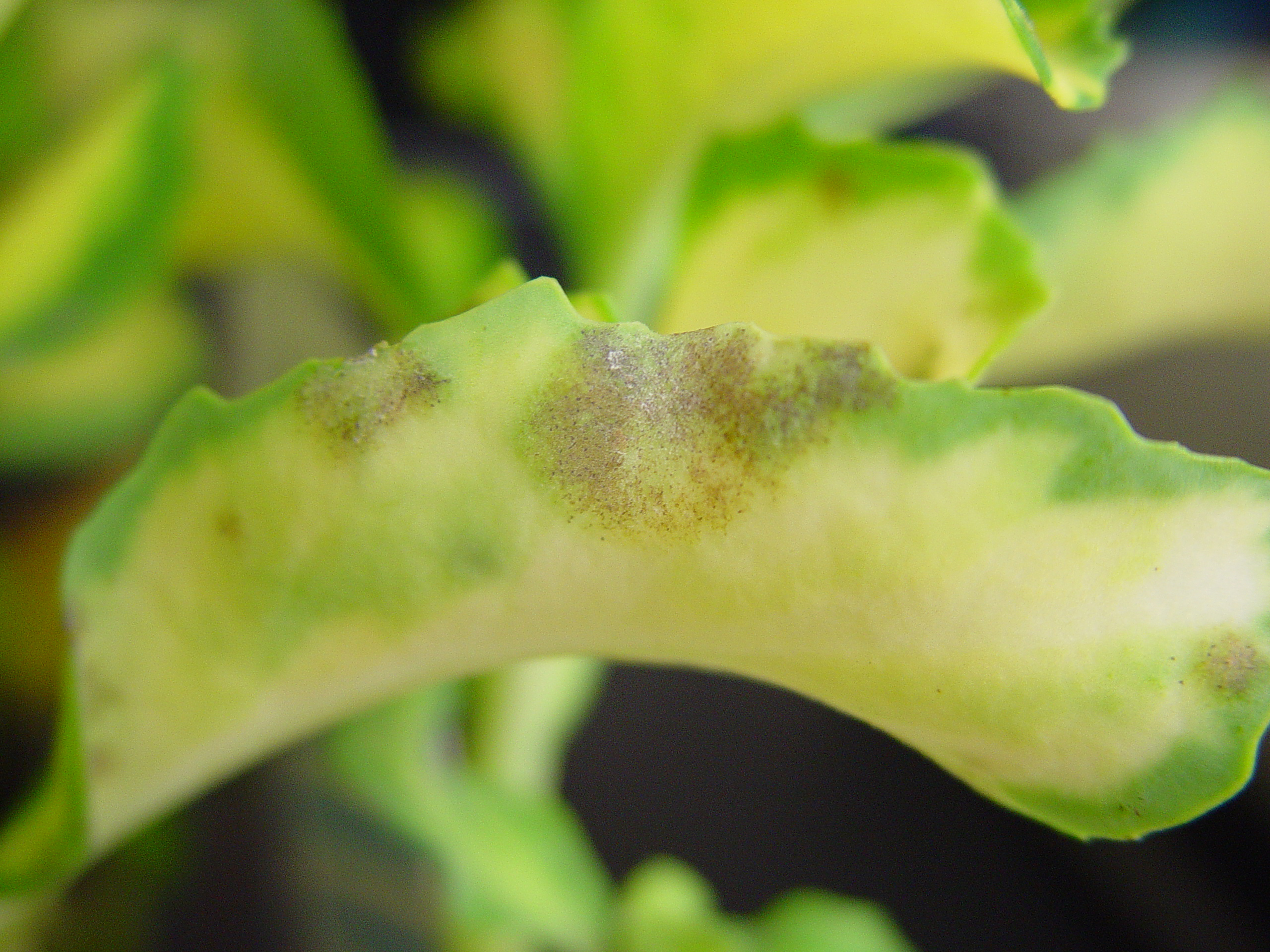 Symptoms: White, talcum-like colonies on the leaf surface. Chlorotic spots may be present on the leaf surface opposite the colony. Under favorable conditions colonies enlarge and coalesce, blighting larger sections of foliage. Severe infections on some hosts cause defoliation. Infection on Sedum causes slightly raised scabby lesions, powdery colonies may not be readily visible.
