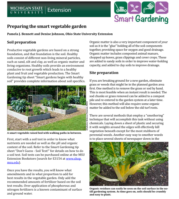 First, start with a soil test in order to know what nutrients are needed as well as the pH and organic content of the soil. Refer to the Smart Gardening tip sheet “Don’t Guess - Soil Test!” for details on how to do a soil test. Soil tests can be purchased online at the MSU Extension Bookstore (search for E3154).