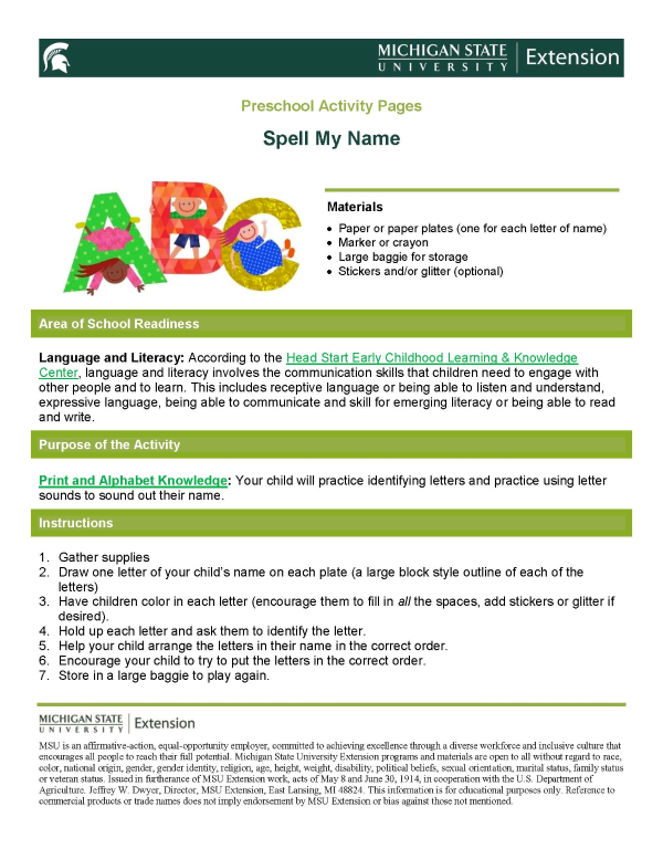 Print and Alphabet Knowledge: Your child will practice identifying letters and practice using letter sounds to sound out their name.