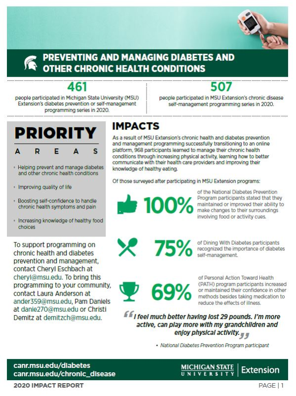 In 2020, MSU Extension continued full recognition status from the U.S. Centers for Disease Control and Prevention for the Diabetes Prevention Program. MSU Extension has expanded programming to include distance learning along with in-person learning. Participants have reported positive health changes from the program, including reducing medications, lowering blood sugar A1C levels and losing weight. The goals of the program include losing 5–7% of one’s initial body weight and incorporating 150 minutes of physical activity per week.