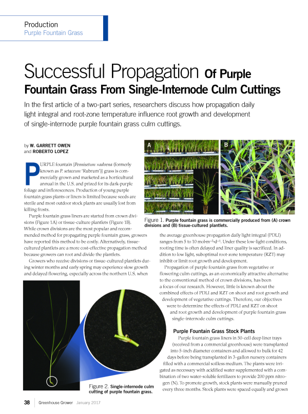 In the first article of a two-part series, researchers discuss how propagation daily light integral and root-zone temperature influence root growth and development of single-internode purple fountain grass culm cuttings.