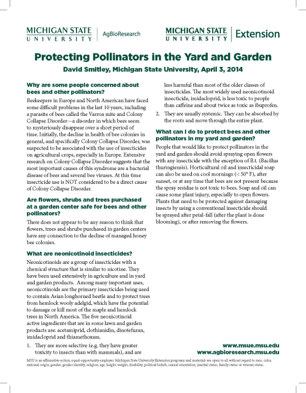 People that would like to protect pollinators in the yard and garden should avoid spraying open flowers with any insecticide with the exception of B.t. (Bacillus thuringiensis). Horticultural oil and insecticidal soap can also be used on cool mornings (< 50° F), after sunset, or at any time that bees are not present because the spray residue is not toxic to bees. Soap and oil can cause some plant injury, especially to open flowers. Plants that need to be protected against damaging insects by using a conventional insecticide should be sprayed after petal-fall (after the plant is done blooming), or after removing the flowers.