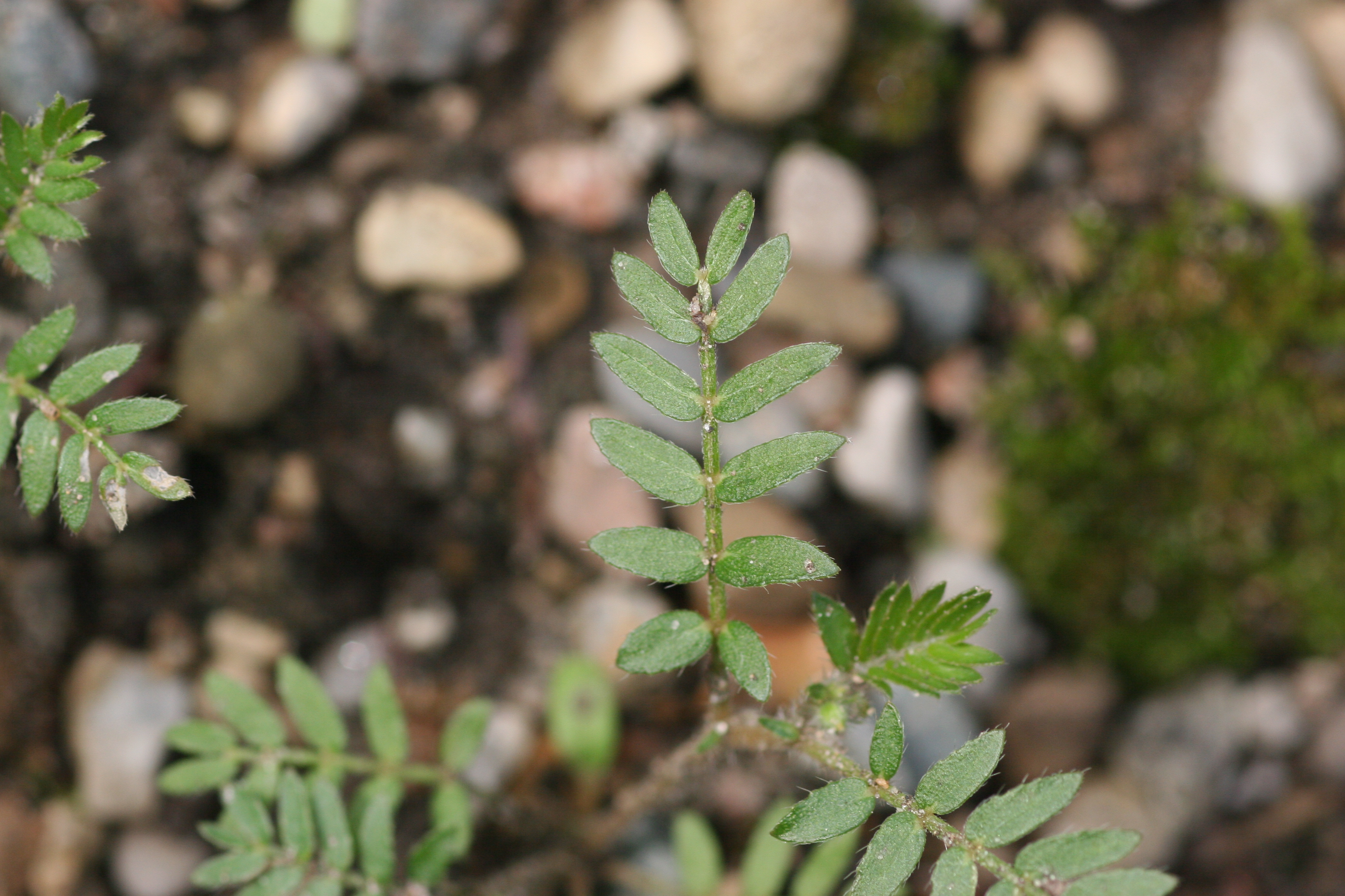 Flowers are small with five yellow petals. Podlike fruit are woody with five triangular burs and sharp spines. Spines are stout enough to puncture tires.