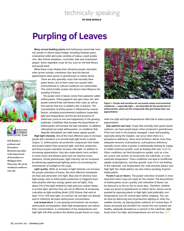 Many annual bedding plants and herbaceous perennials have red, purple or almost black foliage, including fountain grass, ornamental millet and some varieties of coleus, sweet potato vine, New Guinea impatiens, coral bells, kale and ornamental pepper. Some vegetable crops do too, such as red-leaf lettuce and purple basil. While these crops display their attractive purple coloration when grown outside, sometimes they lack the desired pigmentation when grown in greenhouses or indoor farms. There are also specialty crops that normally have green leaves, but at least some turn purple when environmental or cultural conditions are unfavorable. This article briefly reviews the factors that influence the purpling of leaves. The purple color in leaves comes from pigments called anthocyanins. These pigments also give many red- and purple-colored fruits and flowers their color, as well as tree species that turn a reddish color in autumn. The concentration of anthocyanins is influenced by several factors, including environmental conditions (especially light and temperature) and the pH and presence of metal ions (such as iron and magnesium) in the growing substrate. Conditions that increase the biosynthesis of anthocyanins will increase the leaf coloration. In addition, chlorophyll can mask anthocyanins, so conditions that degrade chlorophyll can make leaves appear purple.