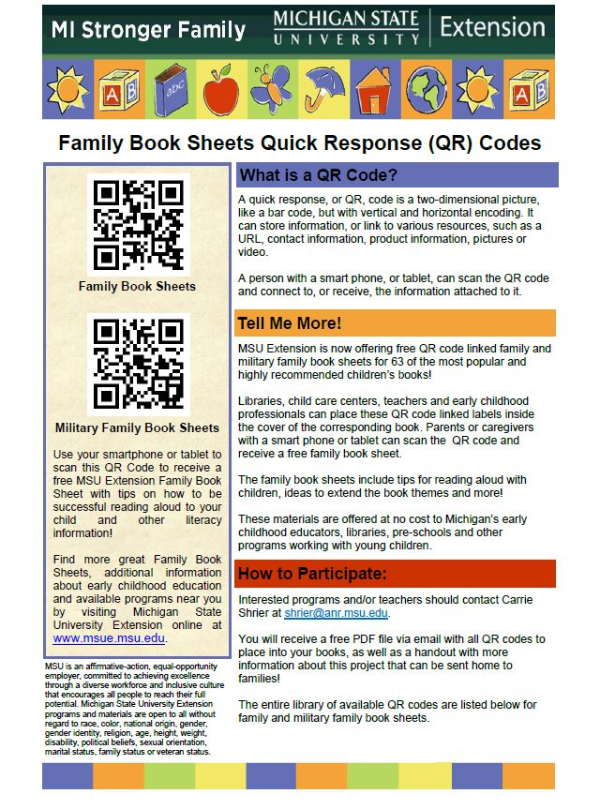 MSU Extension is now offering free QR code linked family and military family book sheets for 63 of the most popular and highly recommended children’s books!