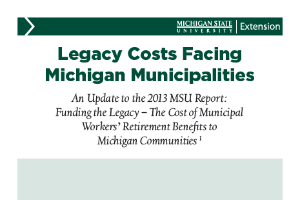 Per Article IX § 24 of the Michigan Constitution, past accrued pension benefits are protected and the state and local governments are contractually obligated to provide these benefits. Once an employee becomes vested in her employer’s defined benefit pension plan (“DB”), the employer cannot take those benefits away. DB pension plans are funded by both employer and employee contributions that are then invested. Pension plan investment portfolios have traditionally tended to be heavily weighted in lower risk and lower return assets. Because traditional investments are not yielding desired returns, in recent years, pension portfolios have taken on more risk with investments that have greater potential returns. Pension fund managers, employers, and employees want to know there will be enough assets in the fund to cover accrued pension benefit payments. Michigan’s municipal governments (i.e. townships, cities, and villages) and counties have a limited number of revenue raising tools to use to meet their contribution obligations. One tool recently made available to Michigan local units is the ability to issue pension obligation bonds.