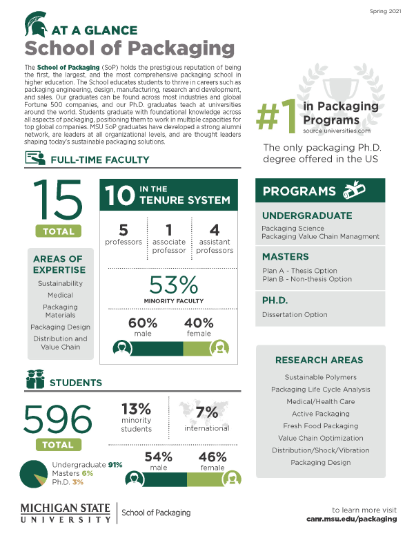 The School of Packaging (SoP) holds the prestigious reputation of being the first, the largest, and the most comprehensive packaging school in higher education.