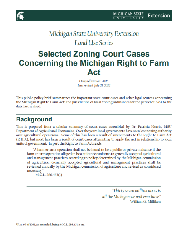 A policy brief on selected zoning court cases concerning the Michigan Right to Farm Act and local zoning jurisdiction. For questions, please contact Mary Reilly. Please make sure your copy is not dated before July 21, 2022.