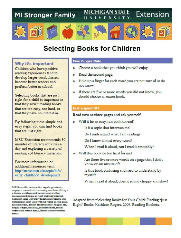 Selecting books that are just right for a child is important so that they aren’t reading books that are too easy, too hard, or that they have no interest in.